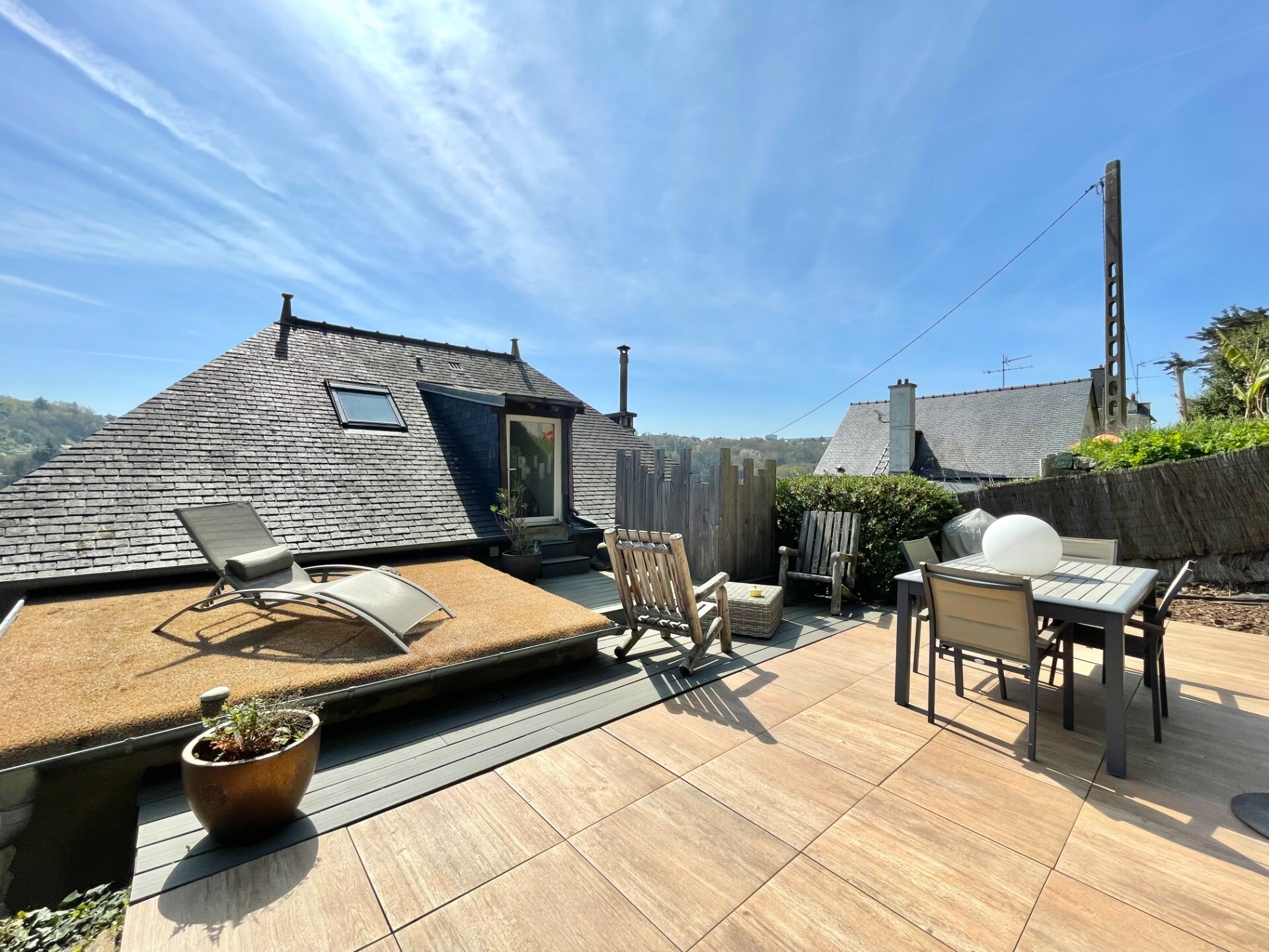 PLÉRIN VUE SUR VALLÉE, Maison de 5 pièces sur un terrain clos et arboré de 502 m², comprenant : entrée, séjour salon 32 m² exposé sud avec cuisine équipée à l'américaine et poêle à granulés, 3 chambres dont une avec salle de bains, espace bureau, salle d'eau et 2 WC. Buanderie et cellier.
