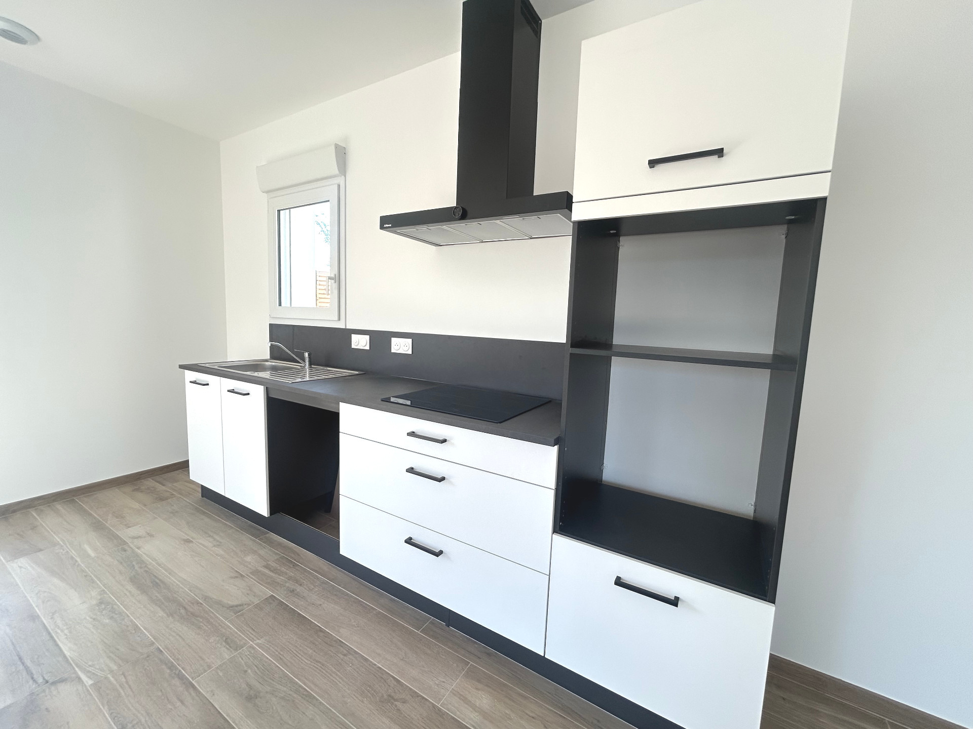 Entrée, séjour avec cuisine équipée à l'américaine 39 m² ouvrant sur terrasse et jardin sud-ouest, 2 chambres avec espace rangement, salle d'eau et WC;