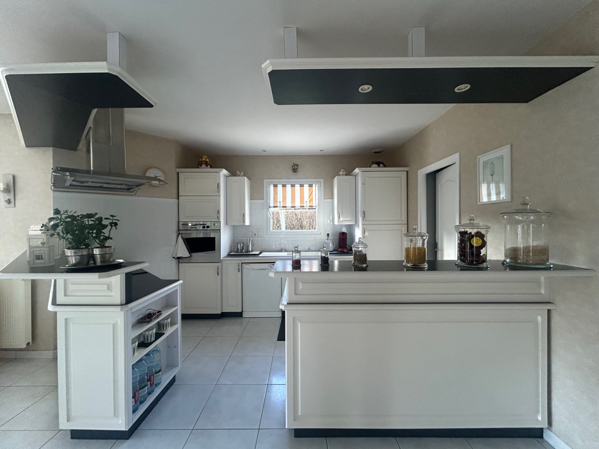 - Au rez-de-chaussée : Hall d'entrée, beau séjour salon avec cuisine équipée à l'américaine 54 m² ouvrant sur terrasse et jardin sud-ouest, bureau, suite parentale avec salle d'eau avec WC, WC et cellier;